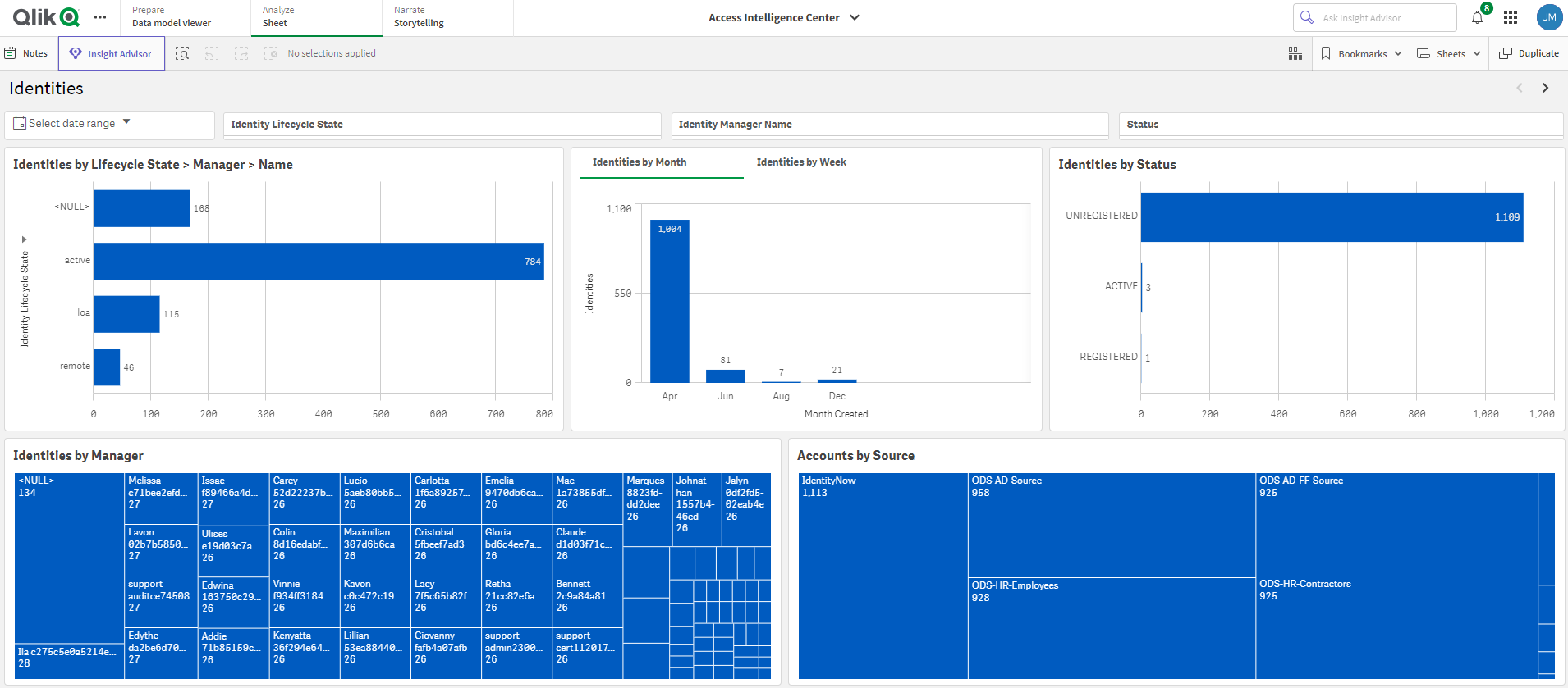 The Access Intelligence Center is SailPoint’s embedded business intelligence tool for viewing and reporting identity governance and administration (IGA) data in ready-to-use charts and dashboards. The authoring feature allows organizations to create and edit customized dashboards based on their specific business and compliance needs. For organizations who want to use SailPoint access data for their own BI tools, SailPoint offers Snowflake Secure Data Sharing, which is the ability to enable customers to securely replicate their identity and search data into their own Snowflake instance and use their preferred business intelligence tool for data visualization and reporting.