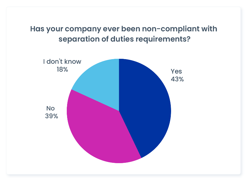 Based on our survey of IT professionals, it is unsurprising that 92% of organizations surveyed require some form of separation of duties. It is an essential security function of a robust access management strategy. What is striking, however, is that 43% of organizations reported that they have failed requirements for separation of duties at some point, which suggests a significant gap in protection.