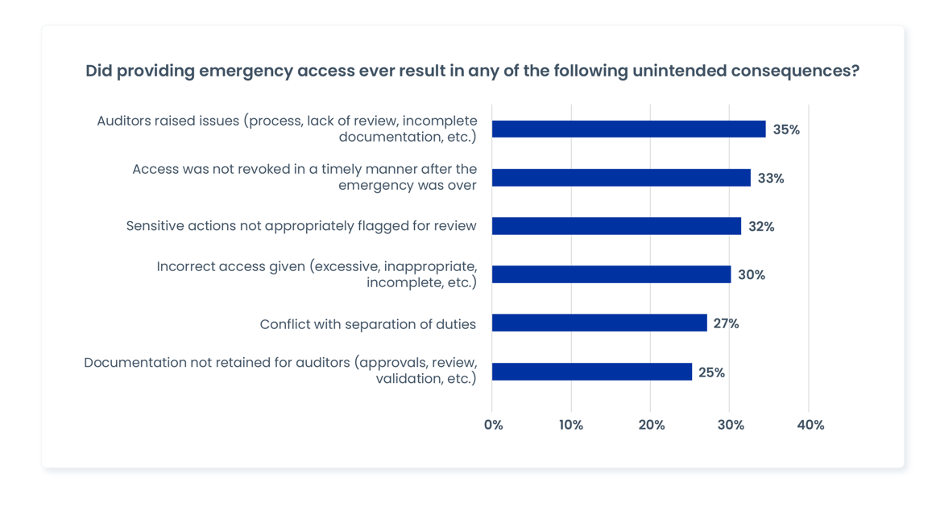 The increased risk of providing emergency access is not just theoretical. Among our survey respondents, some of the leading consequences were audit issues (35%), conflict with separation of duties (27%), and lack of documentation for auditing purposes (25%).