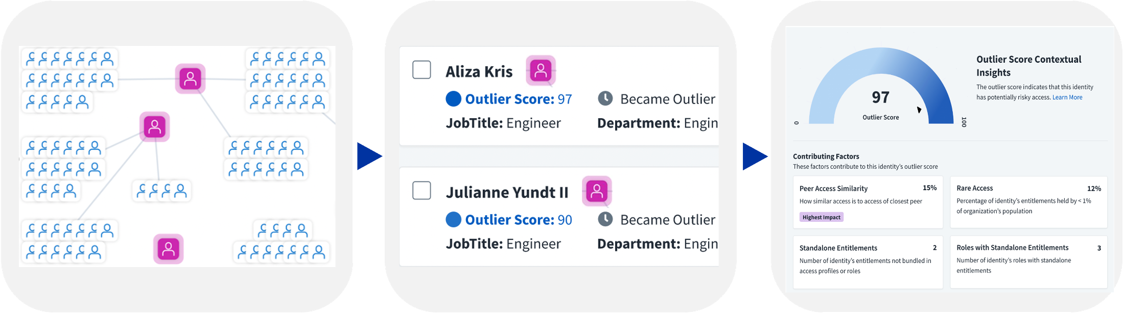 Our recent launch revealed new AI-Driven Identity Security capabilities that can help organizations proactively manage identity security environments. The Identity Outlier Score not only helps organizations spot potential access risks but also helps standardize the measurement of access anomalies across departments. The higher the score, the more likely this individual has potentially risky access. Contextual Insights provides additional information to help business stakeholders understand what factors contributed to the score.