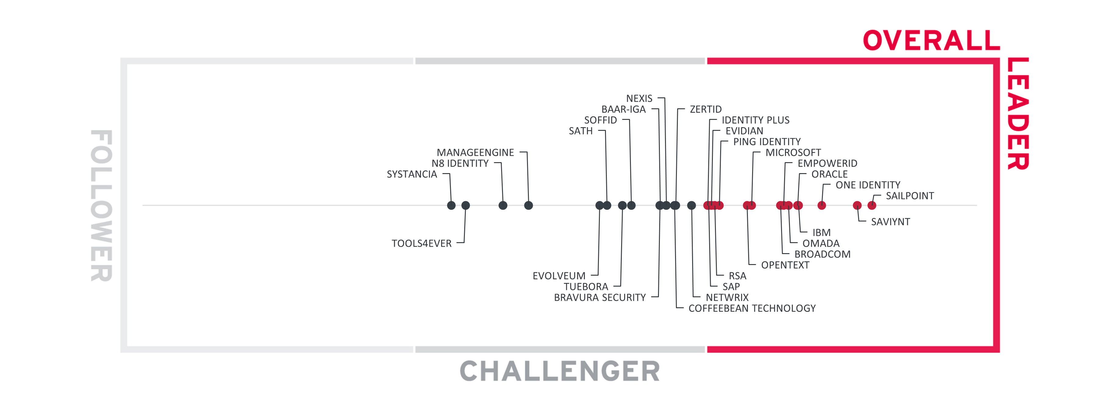 SailPoint recibió la puntuación más alta en Liderazgo General, lo que subraya la funcionalidad global, la presencia en el mercado y la seguridad financiera de la empresa, que superó a otros grandes nombres en el nicho de la IAG. Las capacidades de IAG de SailPoint recibieron una calificación de «Muy positiva» en todas las categorías, lo que pone de manifiesto la capacidad de SailPoint para proporcionar una solución de IAG integral y completa.