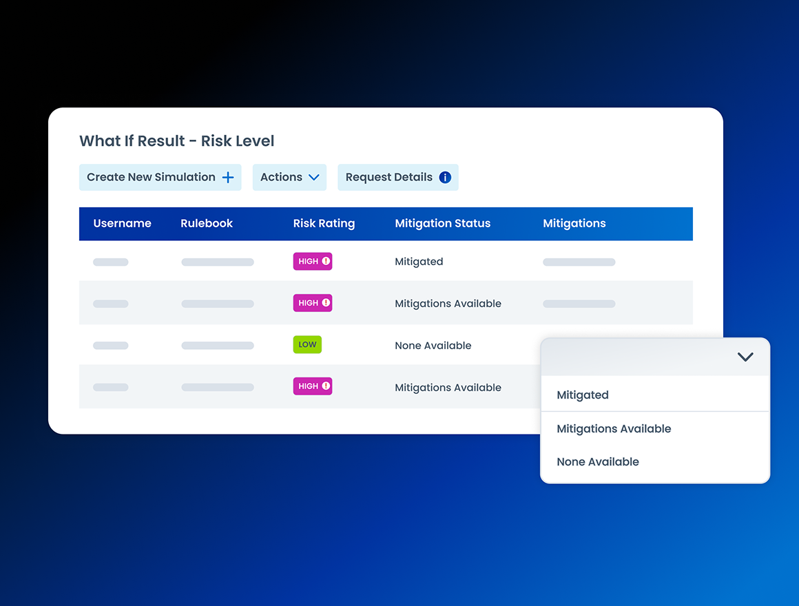 Simulate and analyze access changes before they’re applied to prevent violations and risky combinations of roles. With real-time modeling and automated policy enforcement, SailPoint Access Risk Management helps you maintain compliance and reduce costly audit remediation.