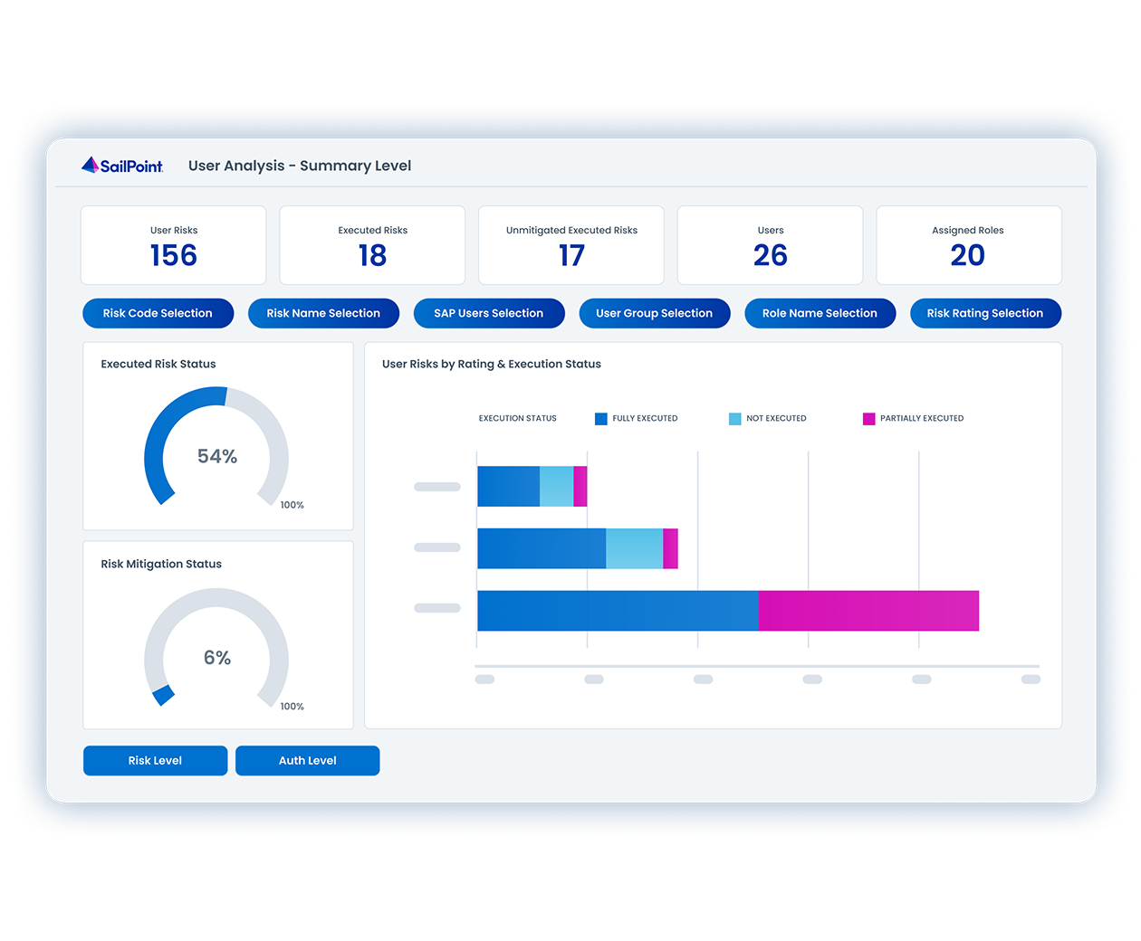 SailPoint Access Risk Management delivers a fast, low-friction path to comprehensive access risk visibility with an enterprise-wide view, intuitive dashboards, and one-step reporting. With no heavy implementations, upgrades, or infrastructure costs, organizations get rapid time-to-value and low total cost of ownership. Automated reporting, streamlined reviews, and agile change management eliminate manual effort while reducing audit and consulting expenses.