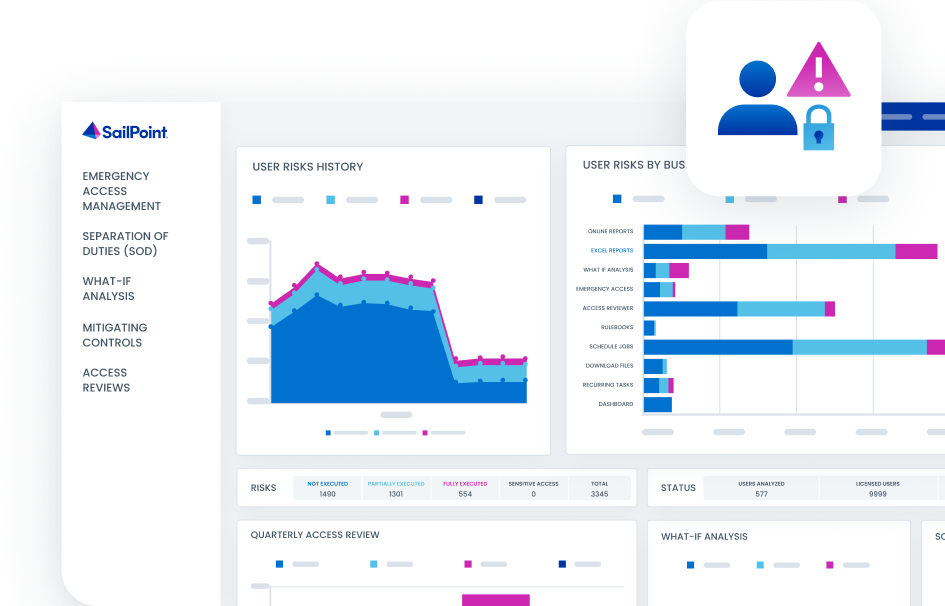 SailPoint 存取風險管理可集中治理存取風險,提供無縫的 GRC 整合及廣泛的企業可見性,以事先預告及避免 ERP 系統發生 SoD 違規情況。自動審查存取權限、記錄風險減緩控制措施、監督緊急存取權限、主動執行風險模擬及輕鬆確保法規遵循,以減少出現稽核缺失和資料外洩的情況。